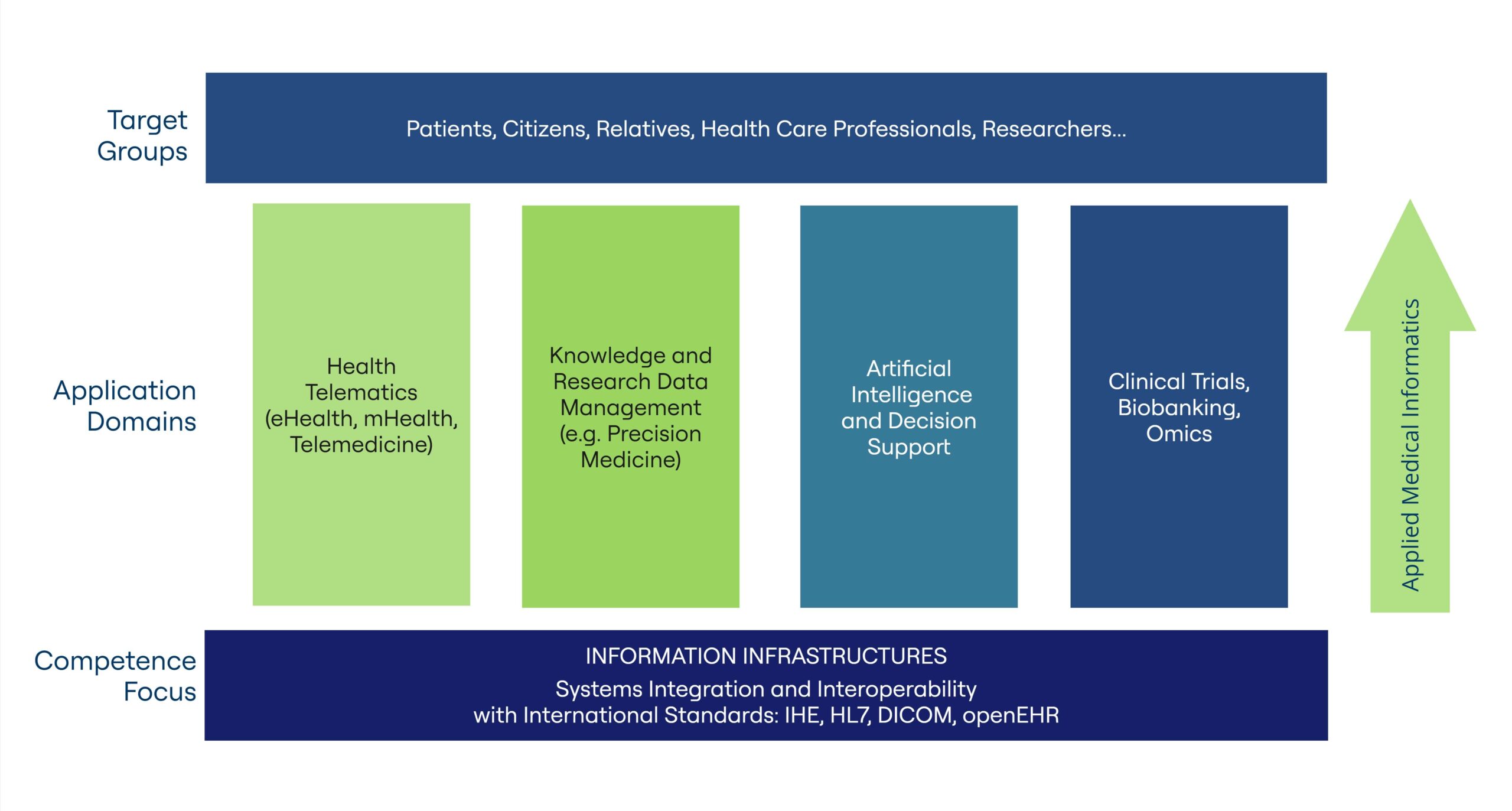 The institute’s research portfolio focuses on four core areas: health telematics (eHealth and mHealth), knowledge management systems for patient care and biomedical research (secondary use of health data), artificial intelligence applications in healthcare and Biobanking and Omics